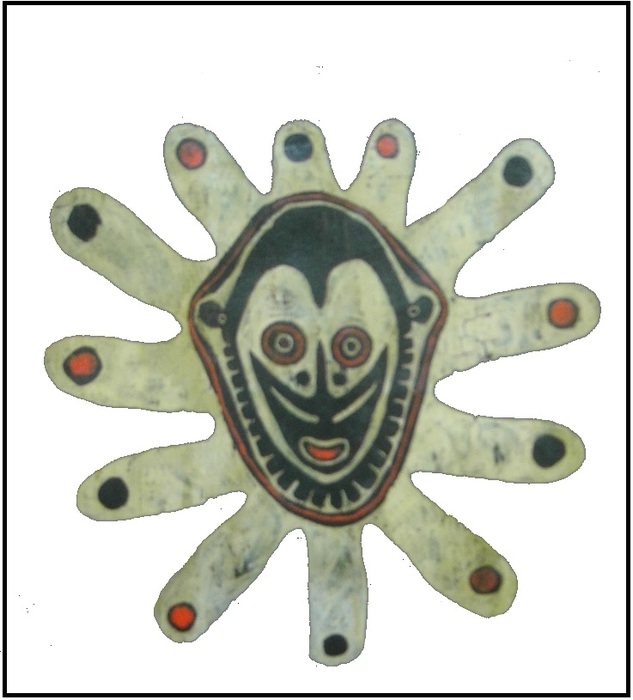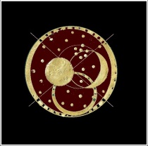 Die nebenstehende Abbildung zeigt die mythologische Darstellung einer ringförmigen Sonnenfinsternis. Der damals bereits offensichtlich bekannte Zusammenhang von Sonne und Mond wird in der Abbildung durch die zwölf „Strahlen“ deutlich. Diese haben abwechselnd (zwei-)farblich verschiedene Punkte. Mit ihnen sind die beiden „Himmelsleitern“ gemeint: Einander abwechselnd steigen im Jahreslauf der Vollmond und der Schwarzmond auf sechs Stufen am Himmel hinauf und herab (und umgekehrt).